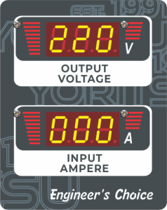 Tampilan digital pada panel depan menunjukkan output voltage dan input ampere (voltage output min / max dan tegangan listrik yang berlebihan). Angka pada digital LED memberikan tampilan yang besar dan jelas sehingga memudahkan bagi anda atau staff teknik dalam memantau kinerja dari stabilizer listrik Yoritsu.